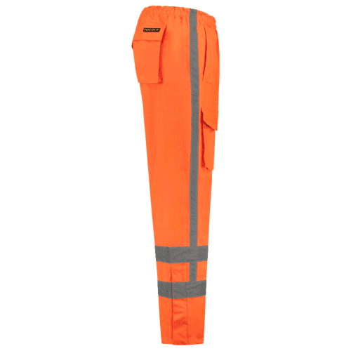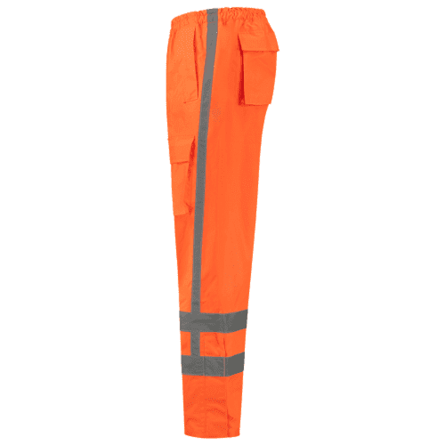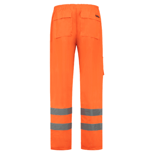 Model: 503001. Deze regenbroek is volledig uitgevoerd conform de richtlijnen van Rijkswaterstaat. Het doek is in een 100% Oxford polyester dat aan de binnenzijde voorzien is van een PU coating waarbij de naden zijn getaped. Derhalve is deze regenpantalon gecertificeerd conform de EN 343 / Klasse 3:3 norm hetgeen de hoogste klasse is voor deze norm en derhalve de optimale combinatie biedt van ademendheid en wind- en waterdichtheid. Naast de Richtlijnen van Rijkswaterstaat is deze regenbroek uitgevoerd in de Hoge Zichtbaarheidsnorm EN ISO 20471:2013 / Klasse 1. De striping is gestikt aangebracht en verder is deze Regenbroek voorzien van praktische en ruime dijbeenzakken. Tevens is er de mogelijkheid tot broekspijpverwijding door de aan de onderzijde van beide broekspijpen aangebrachte afgeschermde lange ritssluiting.